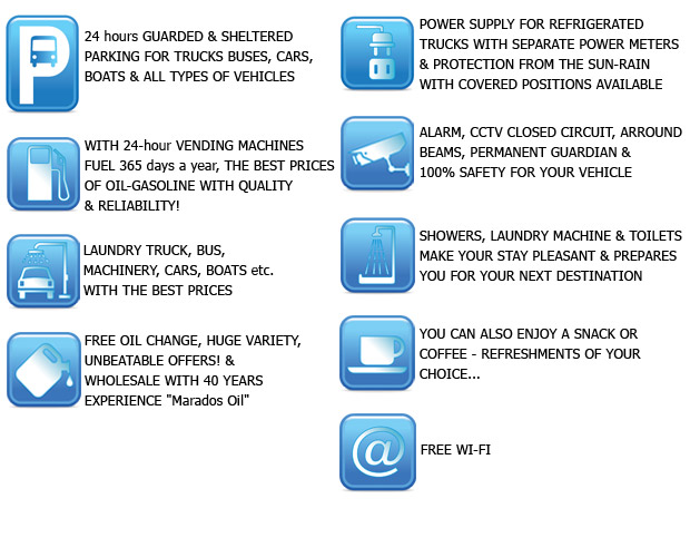 SERVICES: - 24 hour storage - covered parking spaces with water and electricity. - Carwash - Lubrication - Bathrooms - Showers - Laundry - Free Wi-Fi - Liquid fuels with 24-hour vending machine - Cafe – Snack Bar